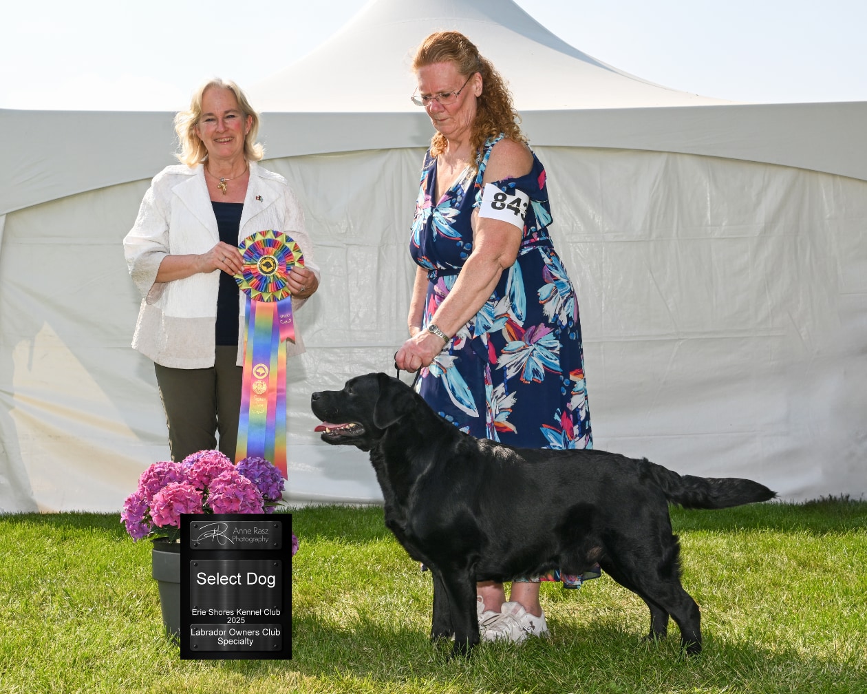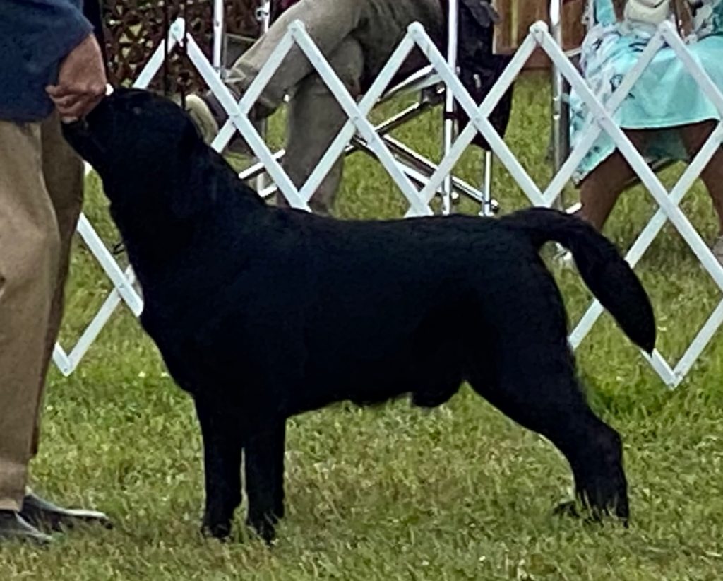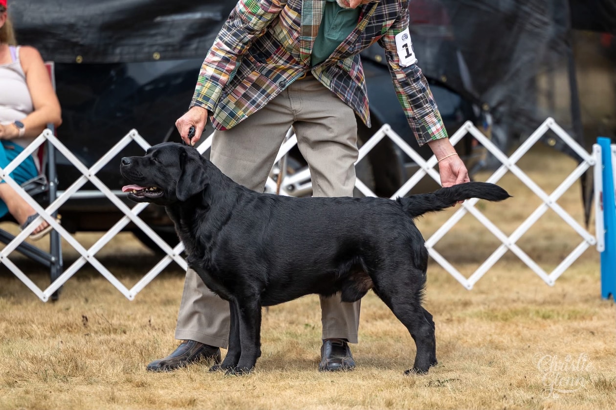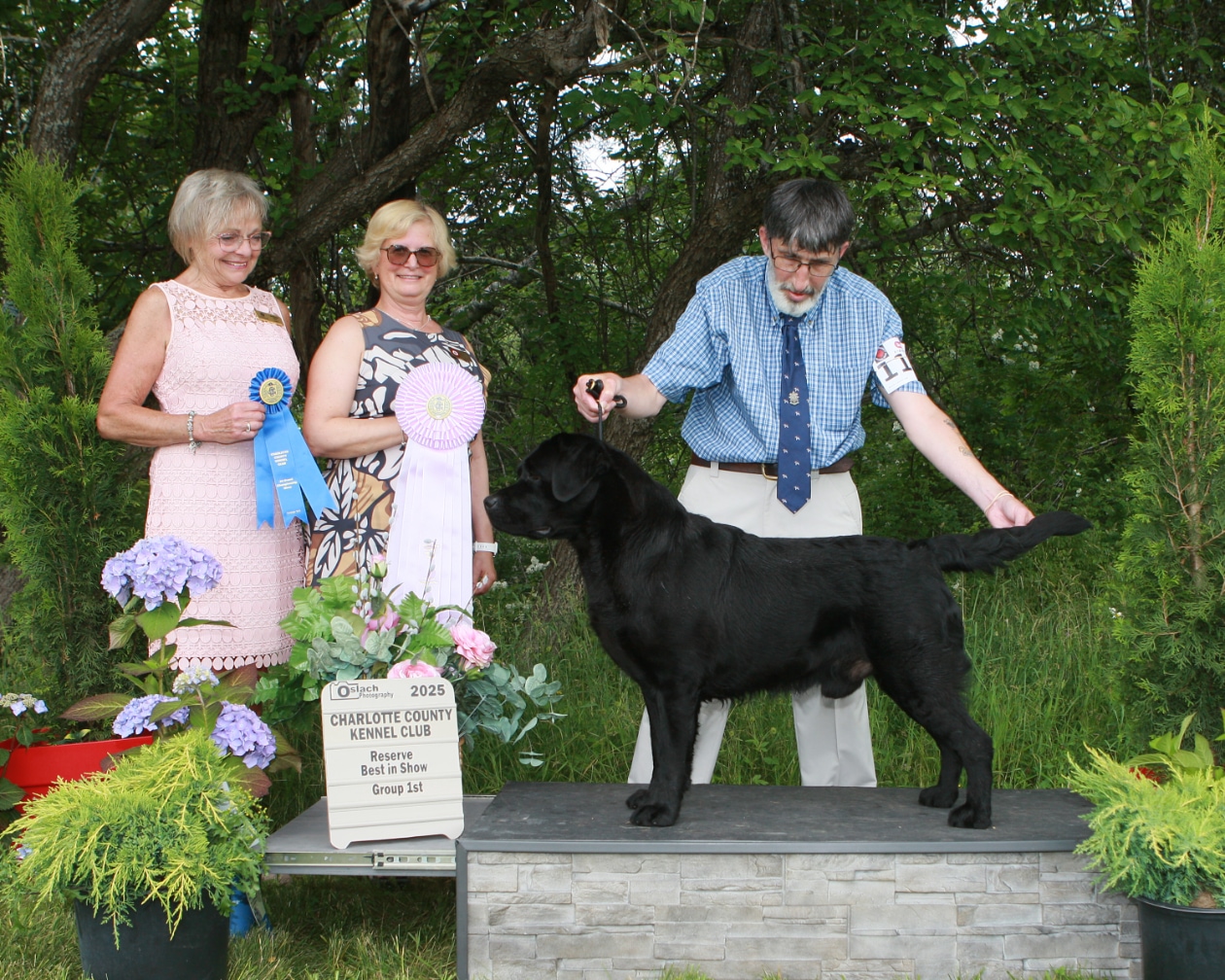 Critique LOC 2025 – Jennifer Cameron Horley: CH Huntsdown Bonham, Select dog. Black, 4 year old, quality boy, moves very well down and back as well as around, with a free gait and strong drive. Ideally proportioned, length to height and body to height. Stands 4 square. Strong masculine head, but not overdone, lovely brown almond shaped eyes, correct ear carriage. Good reach of neck, which seamlessly joins his level topline and tail straight off. Deep chest, legs well under dog. Well let down hocks. Thick double coat.