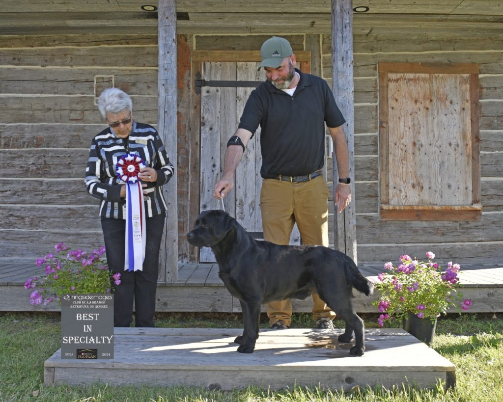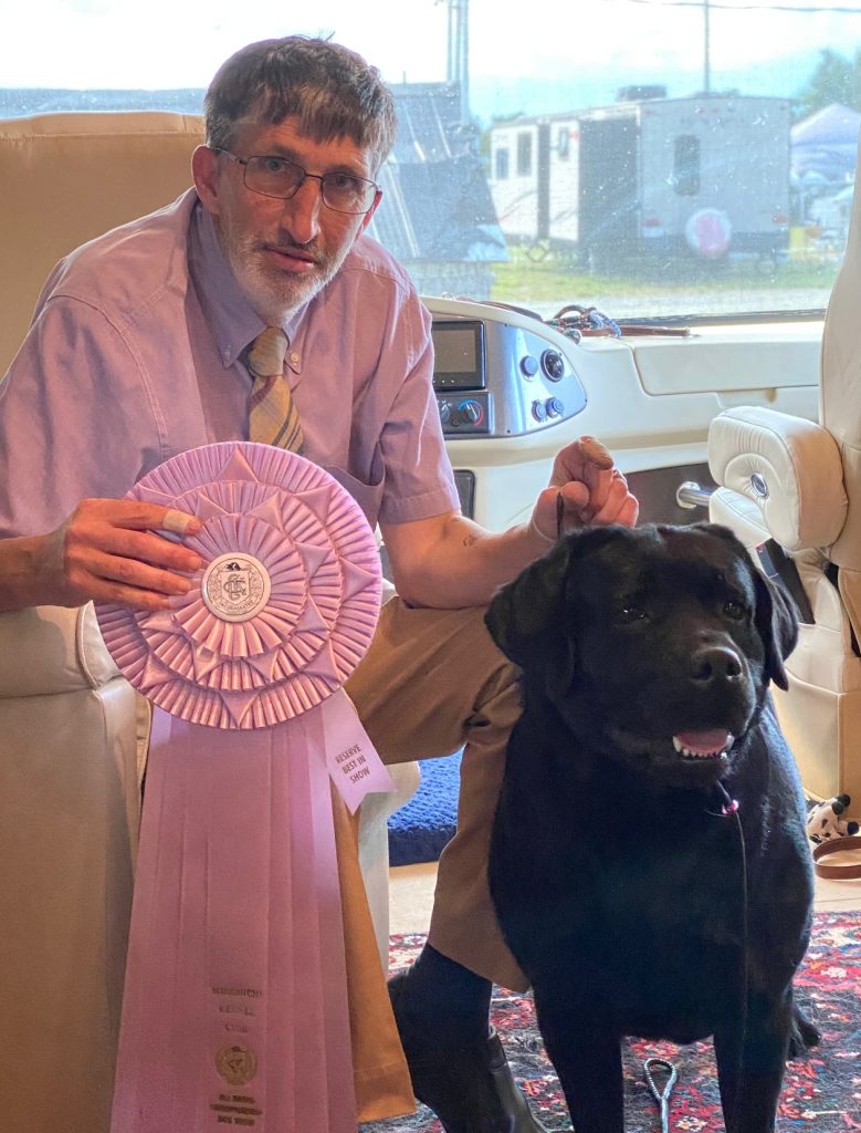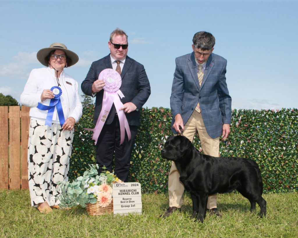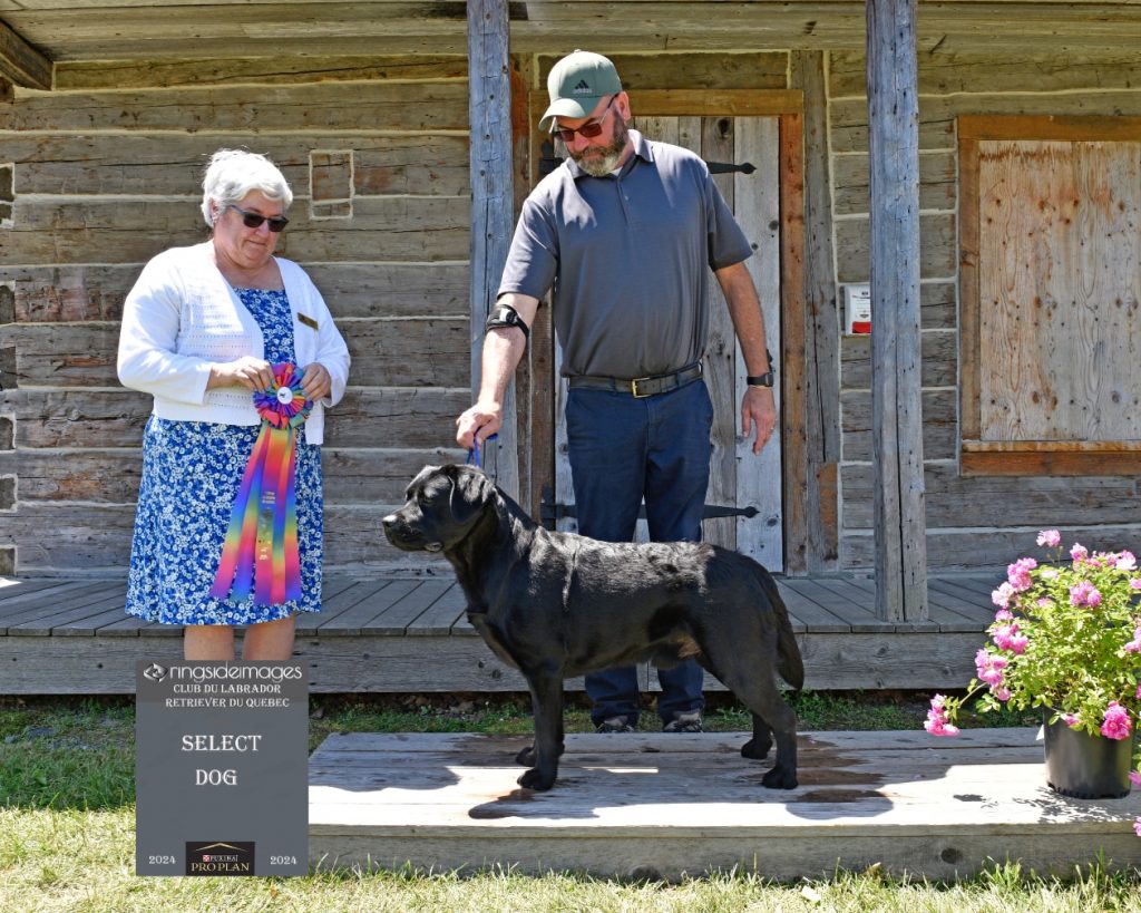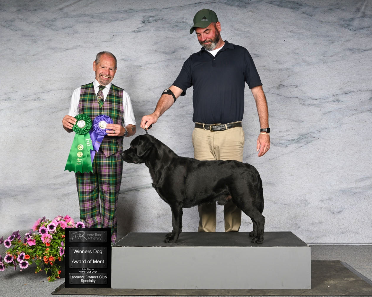 Critique LOC 2024 – Frank Gilroy, UK (Claychalk) – Huntsdown Bonham, liked the boy a lot, has a very good coat and otter tail, correct texture has the correct head, and eye colour, lovely over the neck and shoulders, ample front with plenty of heart room, well boned legs with good tight feet, level top line and tail set that he held on the move, good depth and well barrel ribs. Good rear angulation, ample turn of stifle, and well let down hocks, moved with ease fore and aft. My Winners Dog. Also received a JAM.